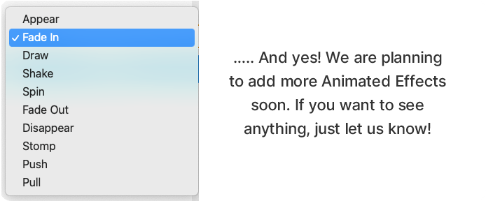 You get all the standard effects that you’d expect to see (Appear, Fade Out, Push, Pull...etc) plus a few other "magnetic" effects that are exclusive to SketchWow animate, including...